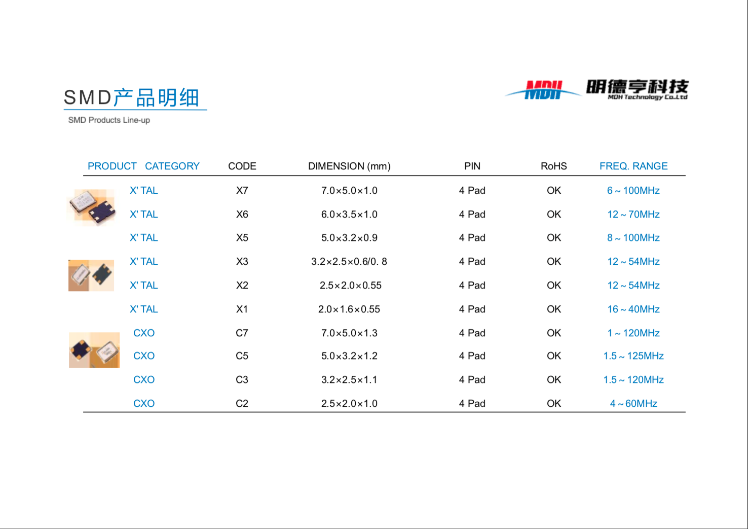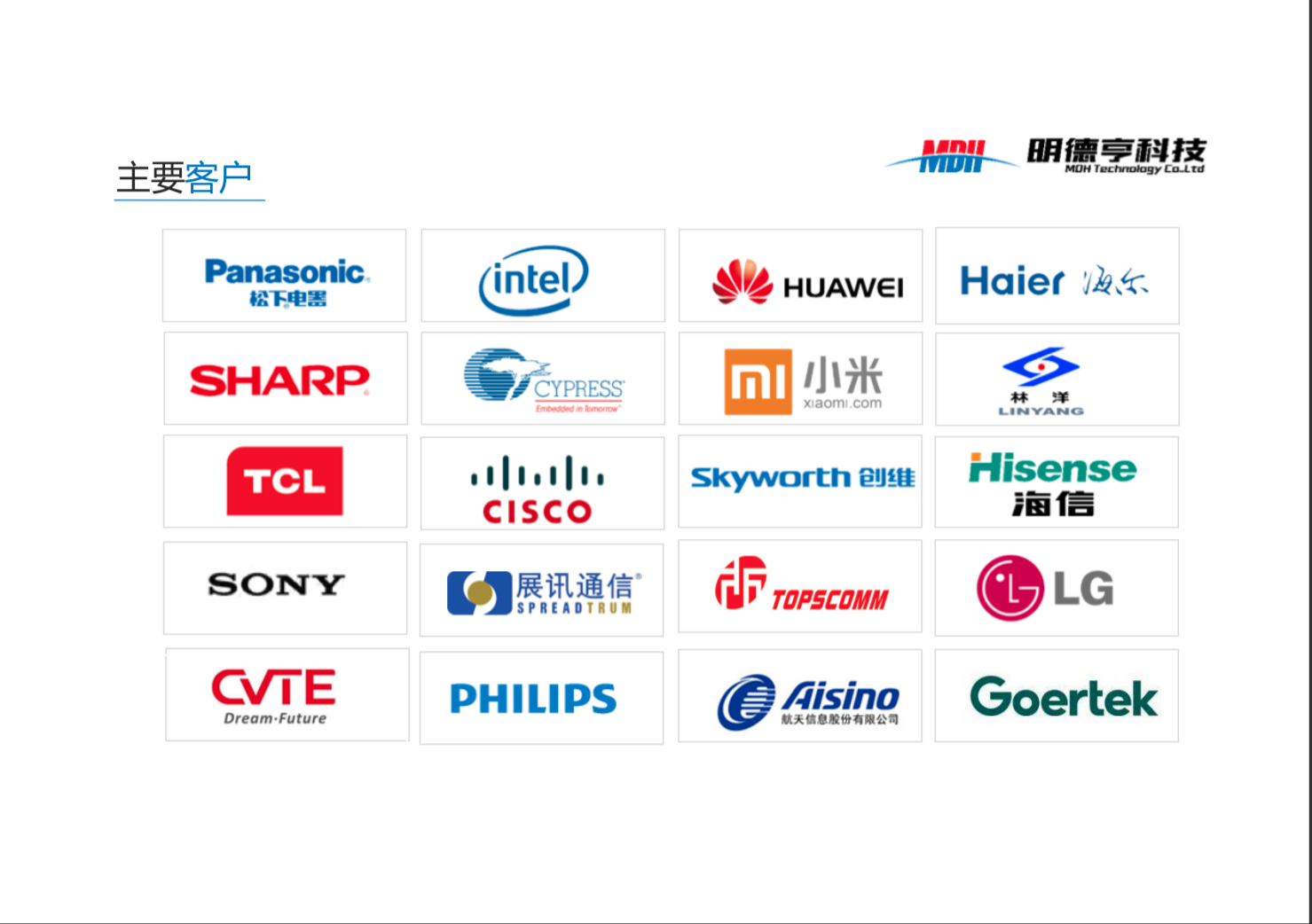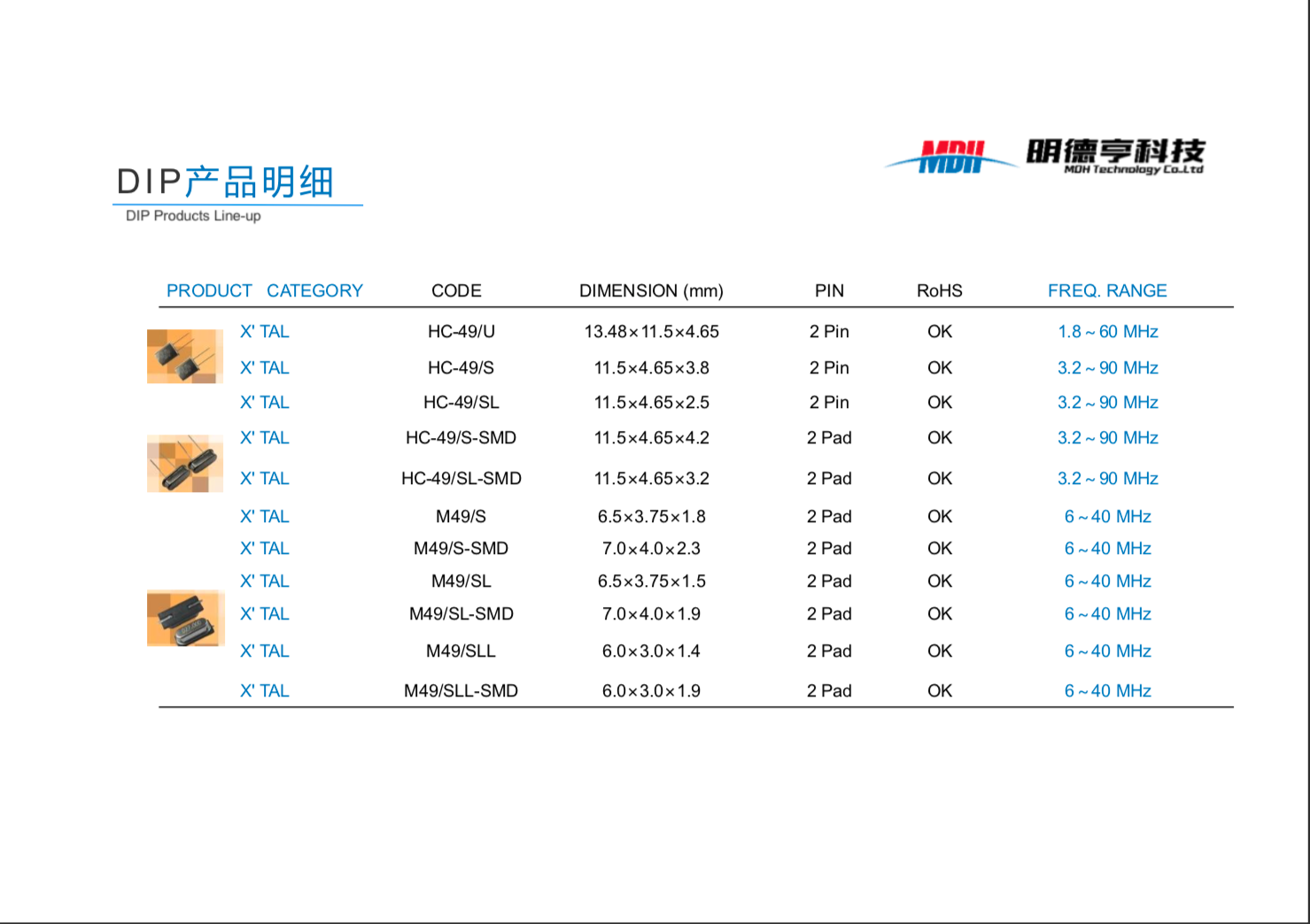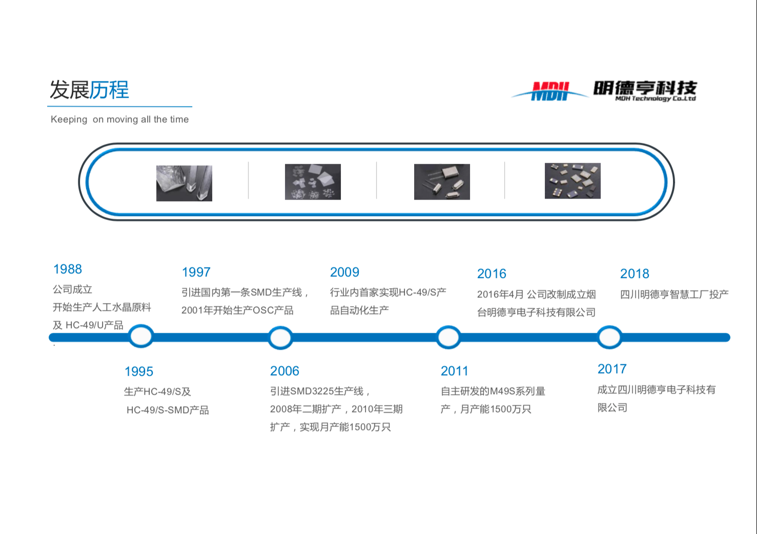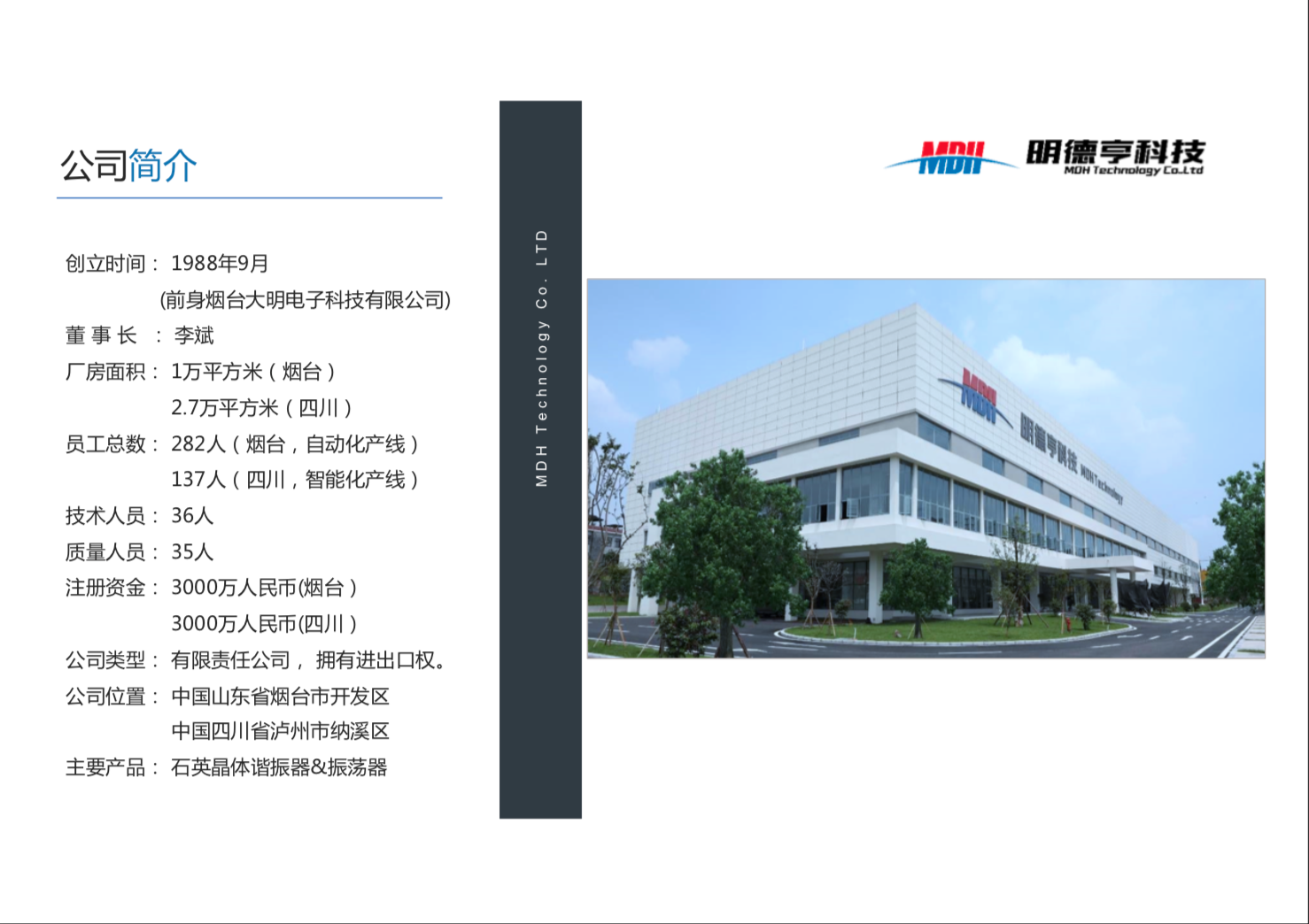 烟台明德亨电子科技有限公司,原烟台大明电子科技有限公司,于1988年成立,原为胜利油田大明集团公司的全资子公司,于2016年4月改制更名),公司注册资本5500万元,总资产1.6亿元,占地面积10000平方米,现有职工200余人。公司是专业生产石英晶体谐振器和振荡器的企业,产品广泛应用于计算机、电视、CD、VCD、DVD、MP3、手机、电话及其基站等通信产品、智能水、电、气表等计量产品,汽车音响、卫星定位系统、雷达设备、网络产品及相关设备,产品主要供应国内外知名品牌客户,如索尼、松下、夏普、飞利浦、日立、歌尔、三星、LG、海尔、海信、TCL、小米等,公司现属于高新技术企业,产品具有广阔的发展前景。