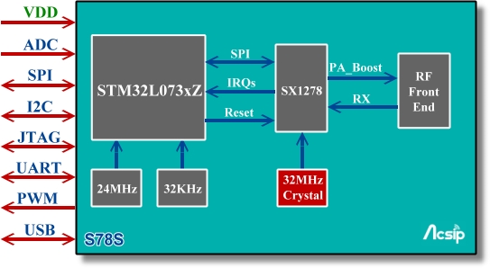 The S78S is designed & manufactured in a smallest form factor - SiP ( System in Package ). It integrate with Semtech SX1278 and a 32-bit ultra low power Cortex M0L MCU ( STM32L073x ), supporting global 433 MHz or 470 MHz ISM-Bands